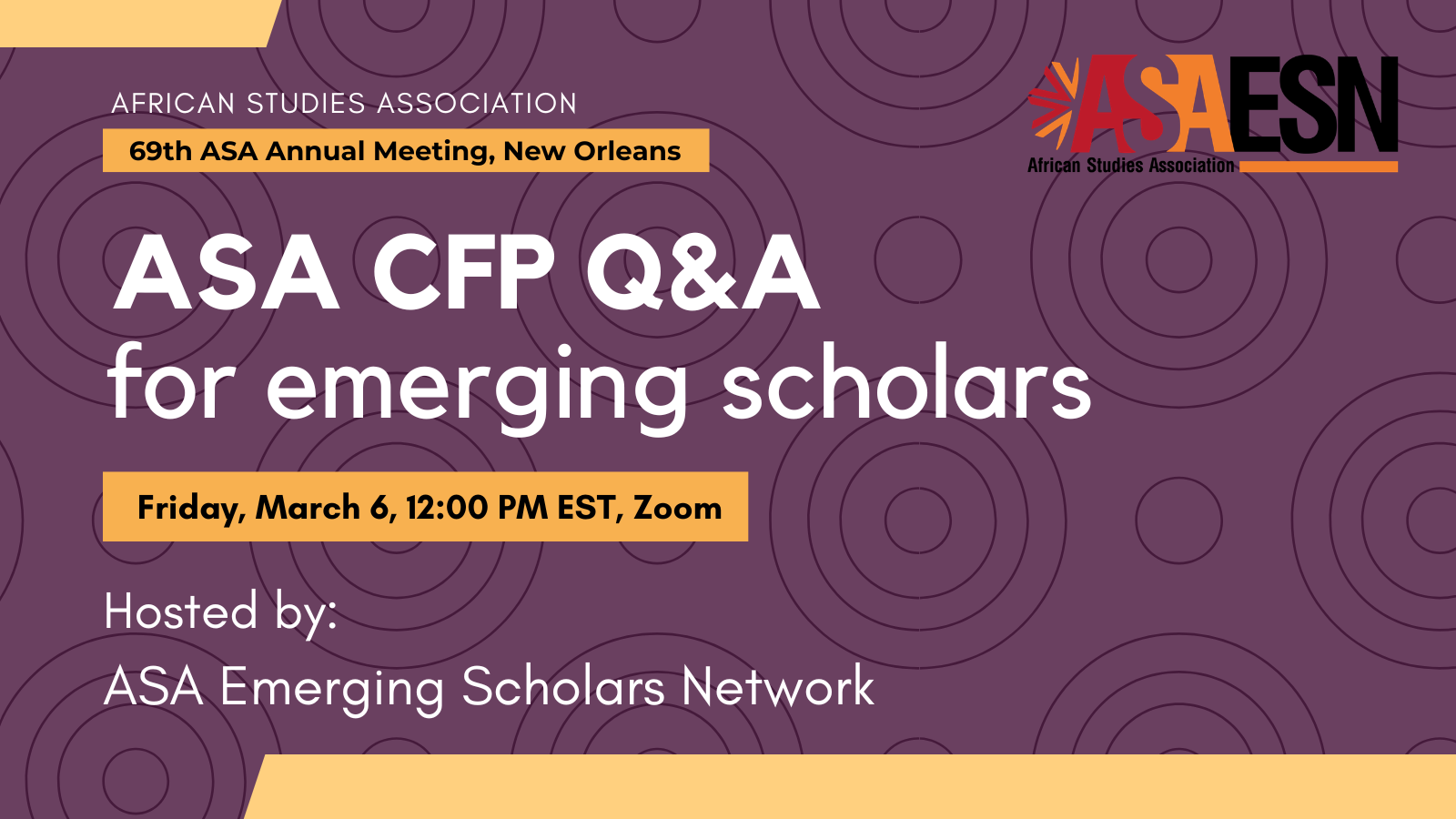 Join the Emerging Scholars Network on Friday, March 6 at 12:00PM EST via Zoom for a Q&A event all about submitting to the African Studies Association CFP. All emerging scholars are welcome!